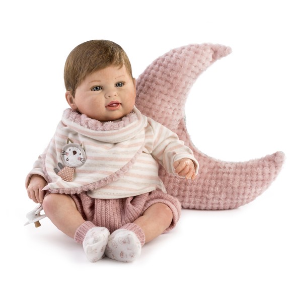 Va vestida con un vestido rosa, braguita a juego, gorro de punto con lazo de raso y calcetines blancos. Su cuerpo con peso proporciona una sensación muy realista al cogerla.