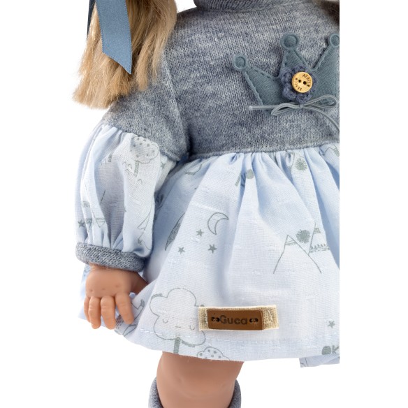 Muñeca Rosalía, rubia con flequillo, dos coletas y lazos de raso azul, lleva un vestido con cuerpo de lana azul y detalle de corona con un botón de madera en el pecho, falda de tela con estampado infantil, y calcetines de lana azul.