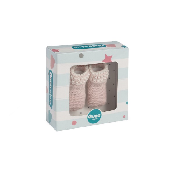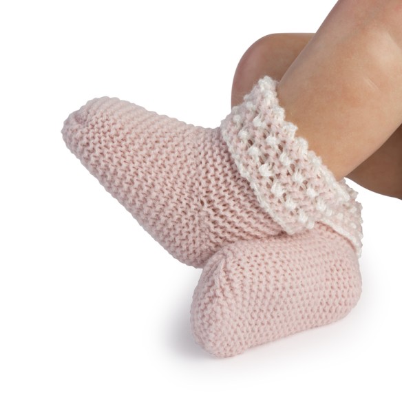 Calcetín de lana rosa con calado blanco para bebé reborn.