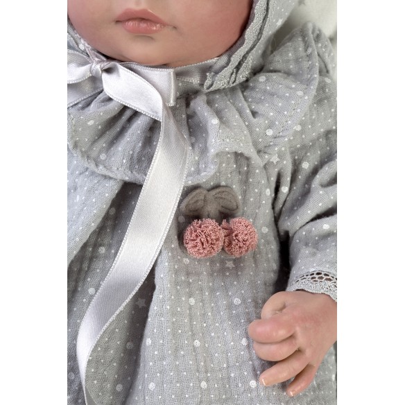 Reborn prematura Manuela, bebé hiperrealista pintada a mano con detalles como rojeces, venas, uñas y textura de la piel. Tiene el efecto de la caída de cabeza como un bebé real. No tiene pelo. Reborn prematuro manuela, lleva un vestido gris con lunares y estrellas blancas, cuello con volante, una capota del mismo tejido y color, lazo de raso gris. Peucos de golden color beig.