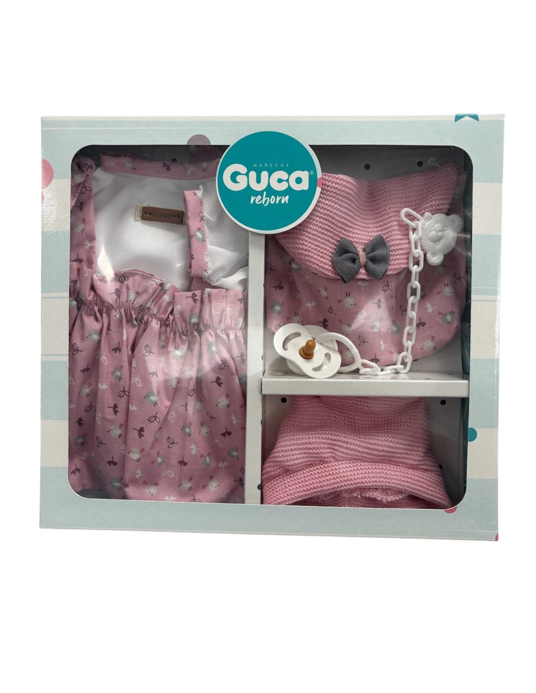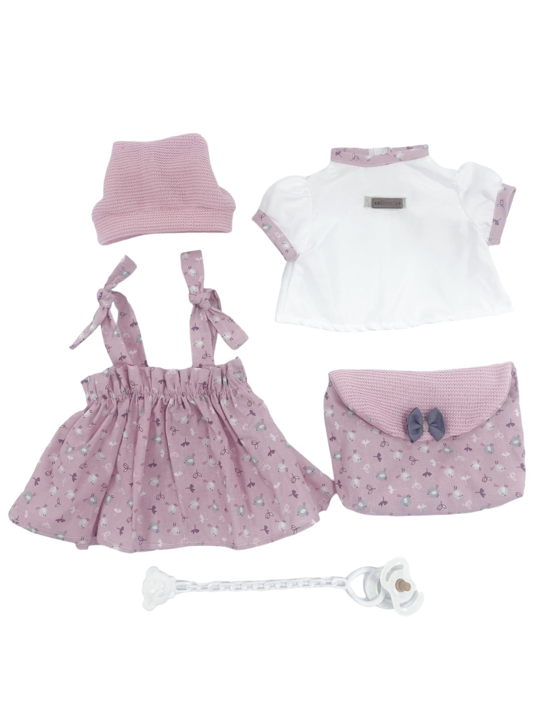 Vestido rosa con tirantes. Camiseta blanca de manga corta. Gorro de lana y Bolso a juego. Incluye chupete.