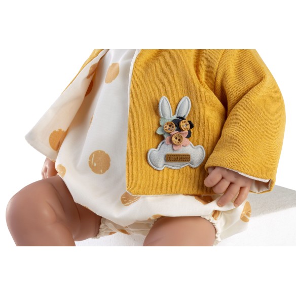 Muñeca Marta, lleva un pelele blanco con lunares ocre, chaqueta ocre con adorno de conejito, gorro y calcetines de punto color ocre. Su cuerpo es de tela y sus extremidades de goma de vinilo. Mide 46cm y está fabricado en España.
