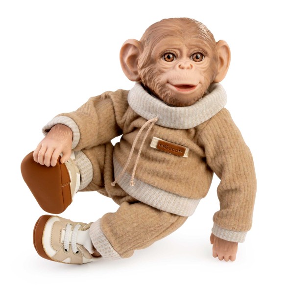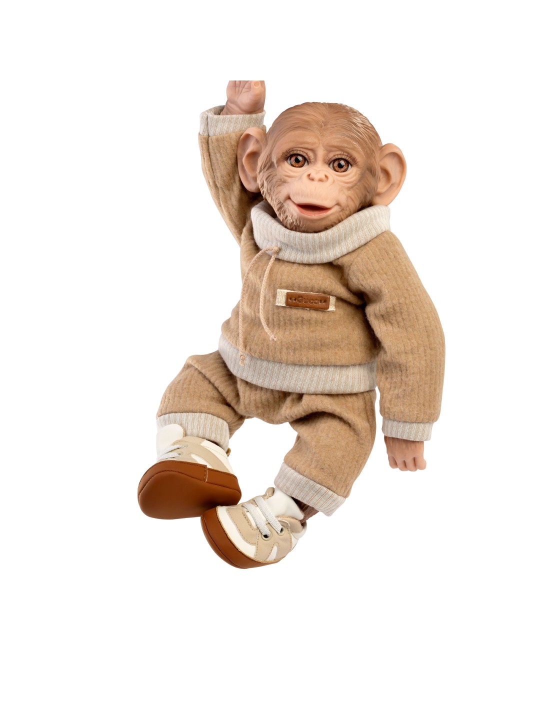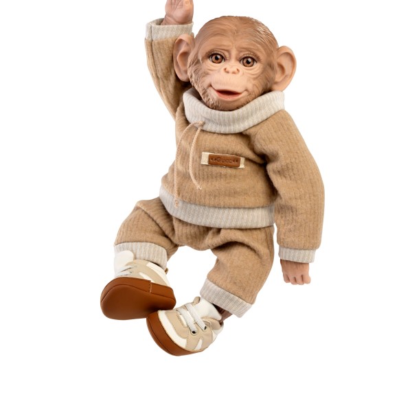 Lleva un chandal marrón formado con un pantalón largo y sudadera de manga larga con puños y cuello vuelto con dos cuerdas. Incuye zapatillas marrones. Adopta posturas y puede colgarse con sus manos o pies. Fabricado en España.