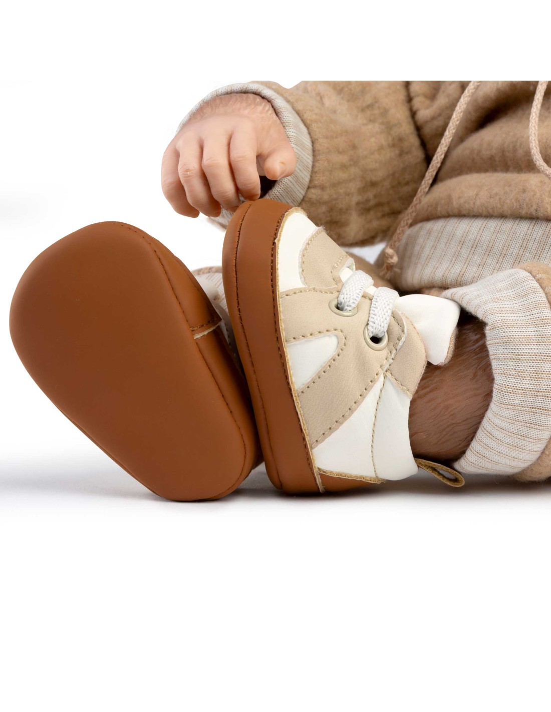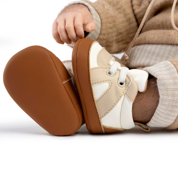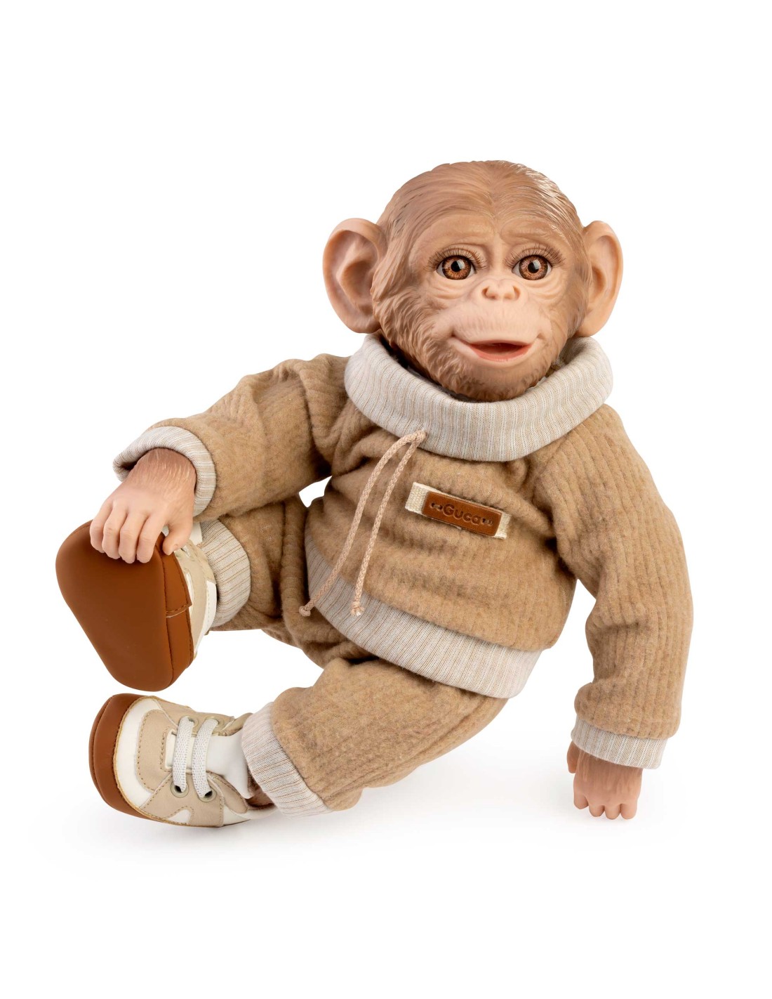 Mono reborn, con cuerpo de tela. Conjunto marrón de chándal beig y zapatillas