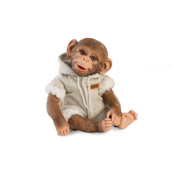 Mono Reborn de 32 cm con cuerpo de tela. Lleva pelele gris con detalles de pelo. Fabricado en España por Muñecas Guca.