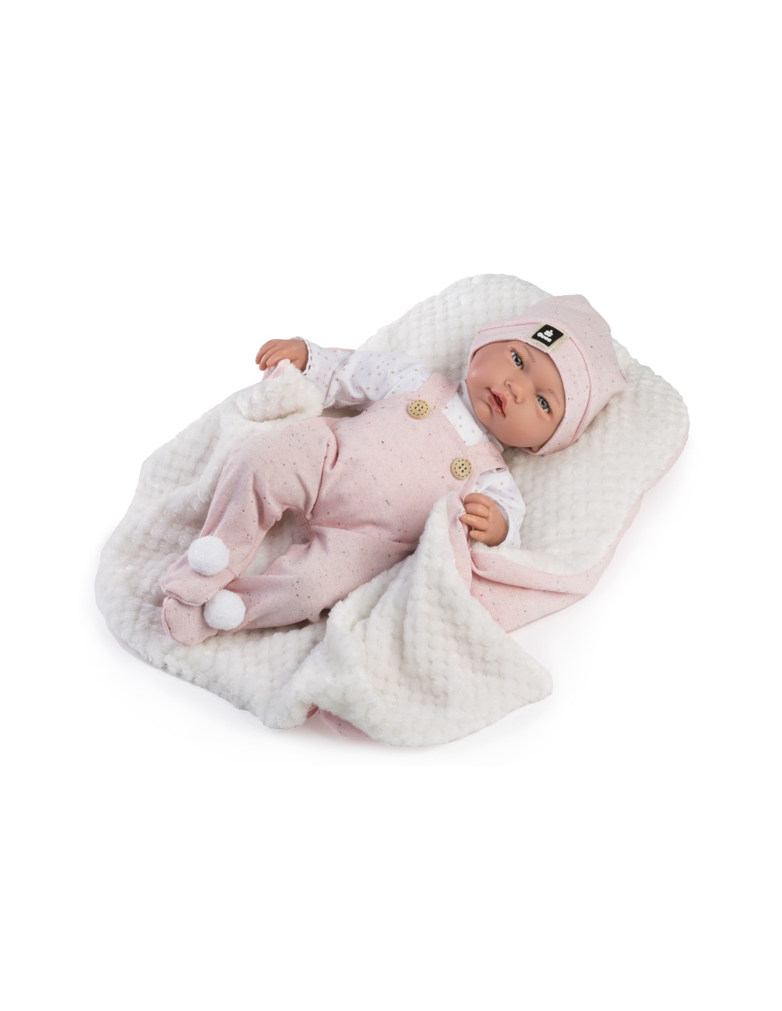 Muñeca con sonido de bebé Indira, peto rosa, camiseta y gorro, con manta - 38cm