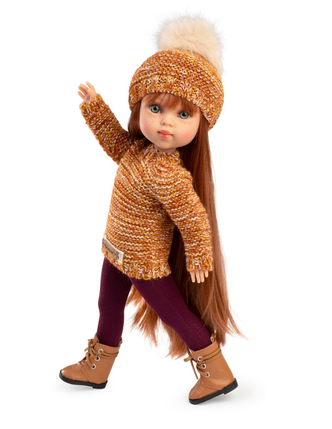 Muñeca Penelope Copenhague – Pelo largo pelirrojo. Jersey y gorro de lana, leggins granates y botas. Fabricada en España por Muñecas Guca.