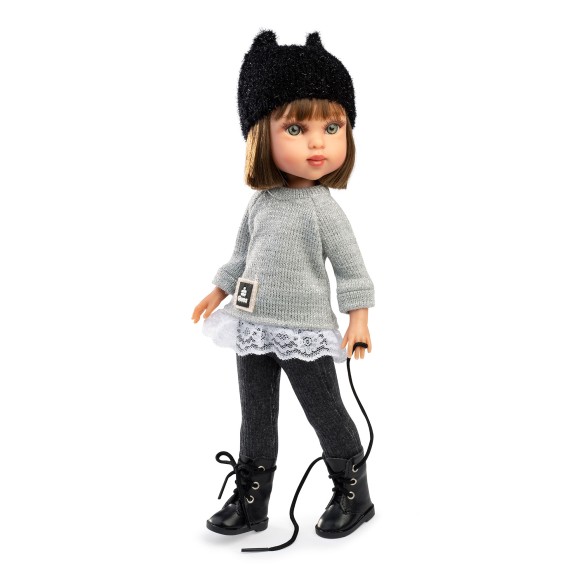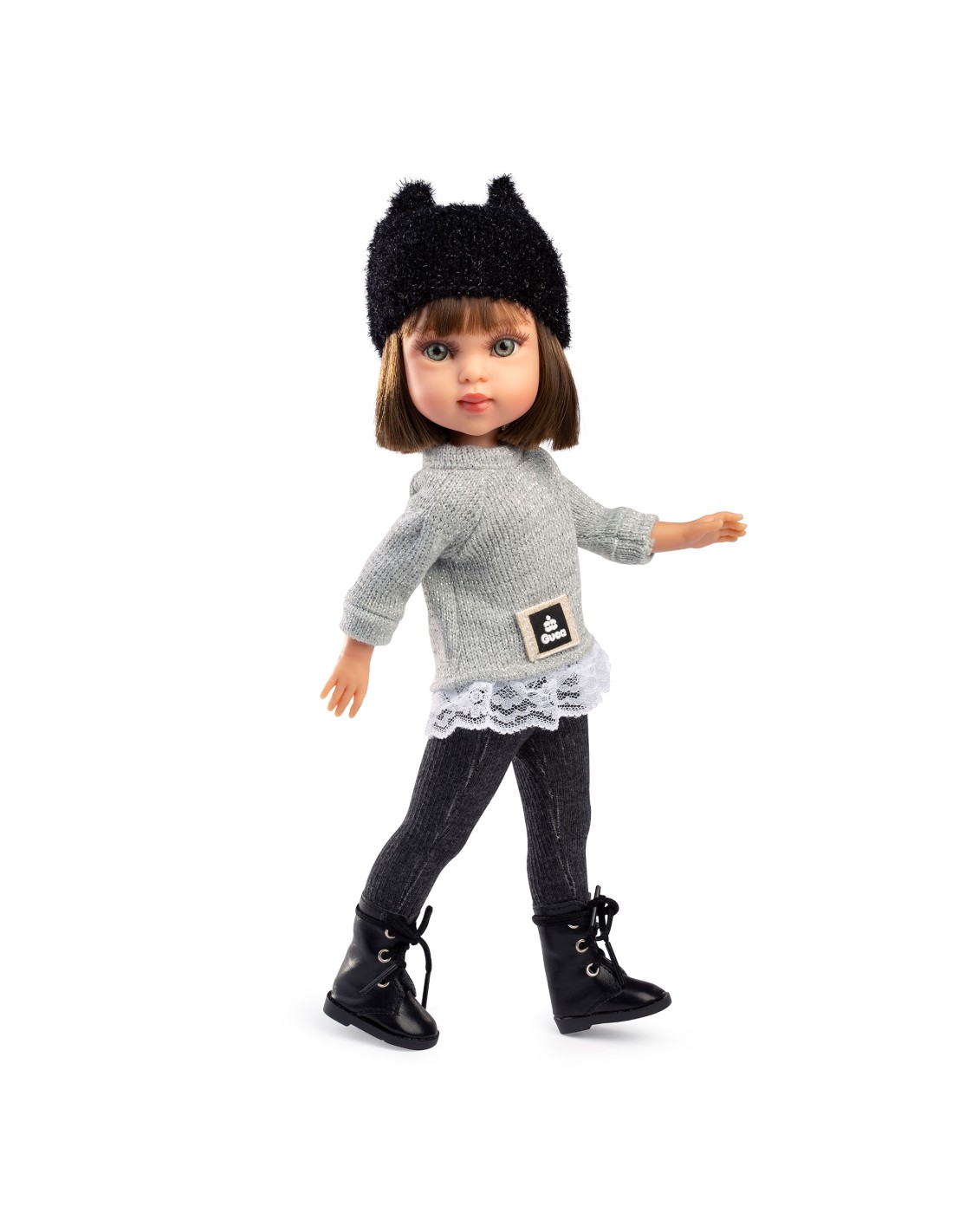 Penélope Lisboa es una muñeca de 33 cm con pelo moreno. Lleva jersey gris, leggins negros y botitas negras. Fabricada en España por Muñecas Guca.