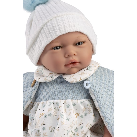 Julen es un muñeco con peso de 42 cm y 1,71 kg. Viste pelele blanco, chaqueta azul, gorro a juego y calcetines azules.