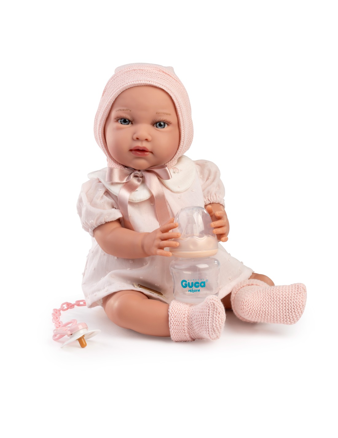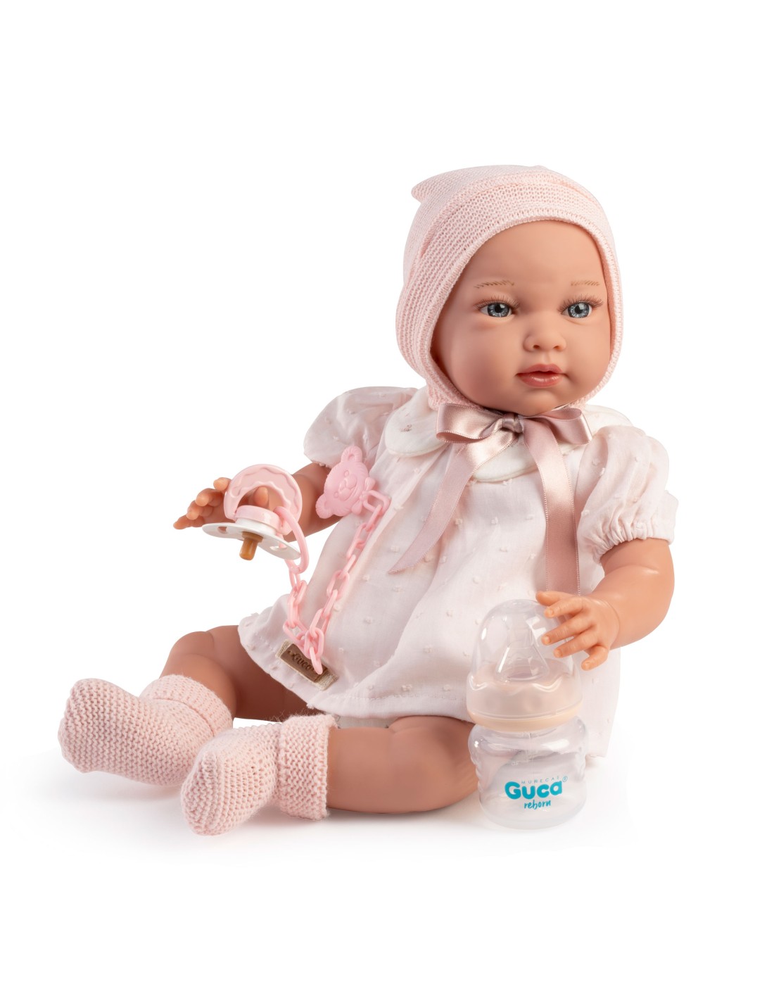 Muñeca con peso Lola, vestido rosa y beig con cuello, gorro y calcetines de lana rosa, chupete y biberón.