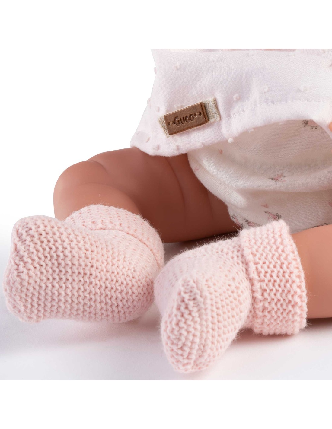 Lleva un vestido de manga corta y cuello bebé color rosa. Su capota y calcetines son de lana rosa. Tiene el efecto de caída de la cabeza como un bebé real.