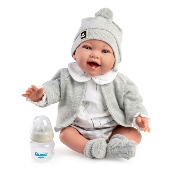 Muñeca con peso Zuri, camisa blanca, braguita de cuadros gris, chaqueta y gorro de lana. Con biberón y calcetines.