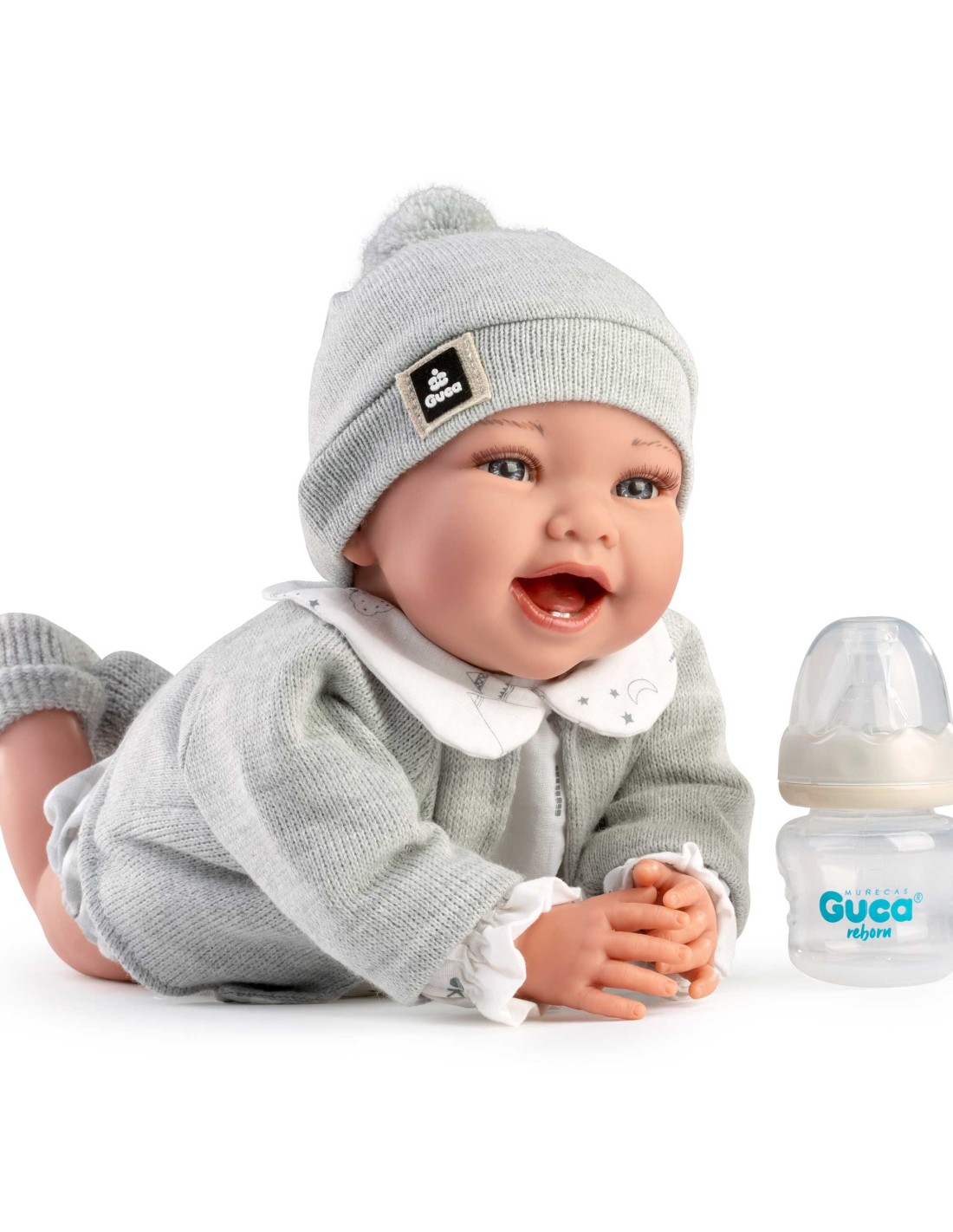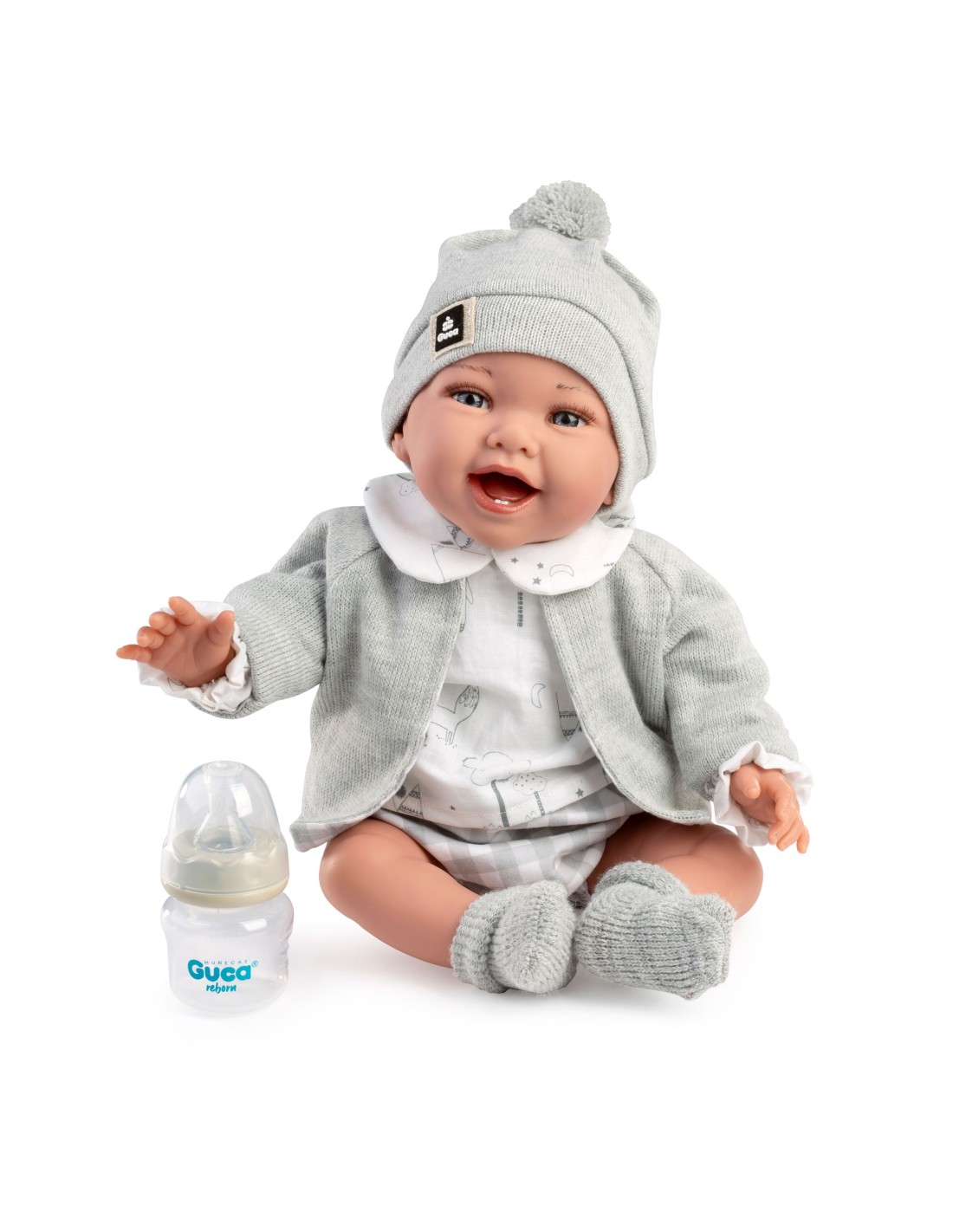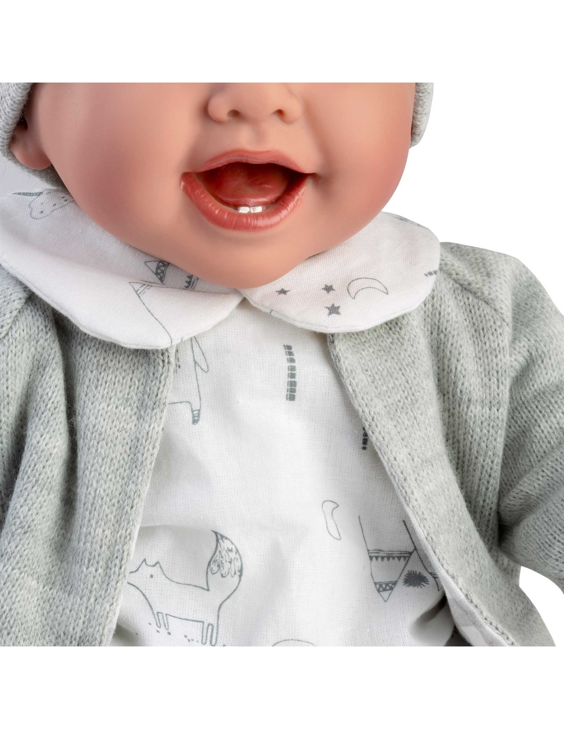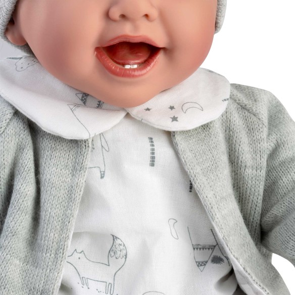Está vestido con una camisa blanca con dibujos infantiles en tonos grises, chaqueta de lana gris y braguita de cuadros blancos y grises. Su gorro con pompón y clacetines también son de lana en tonos grises.. Tiene el efecto de caída de la cabeza como un bebé real.