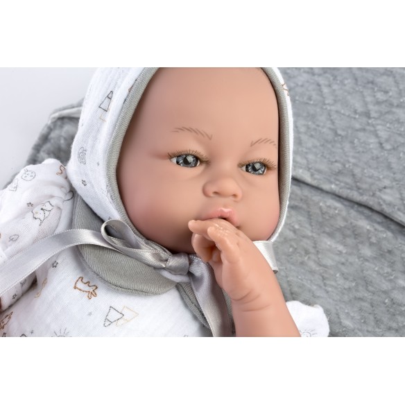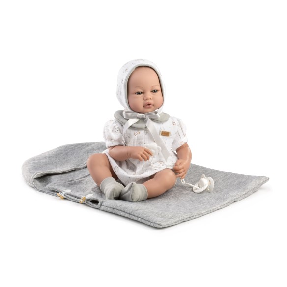 Muñeco Eric, bebe sin pelo, su cuerpo es de tela, su cabeza, piernas y brazos son de goma de vinilo. Eric, va vestido con pelele de manga corta blanco con dibujos, cuello gris, capota y peucos de lana gris. Como complemento incluye chupete con cadena blanco y saco gris para meter al bebé con 2 cierres de madera. Mide 46 cm. No tiene mecanismo. Fabricado en España.