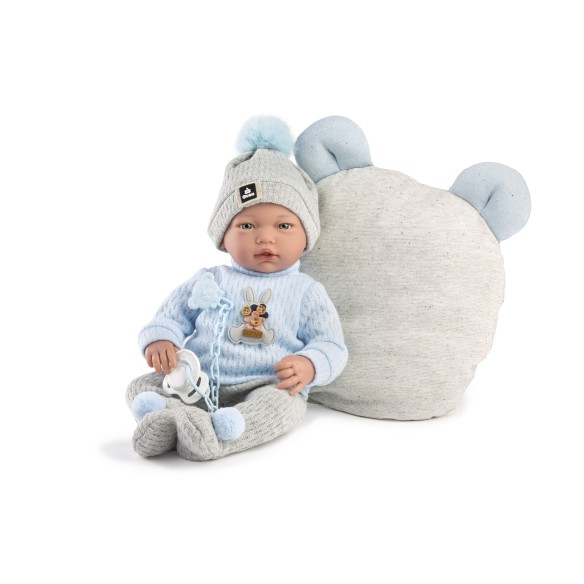 Como complemento lleva un cojín gris con orejas azules y un chupete con cadena. Mide 38 cm. Su cuerpo es de tela y extremidades de goma de vinilo. Fabricado en España.