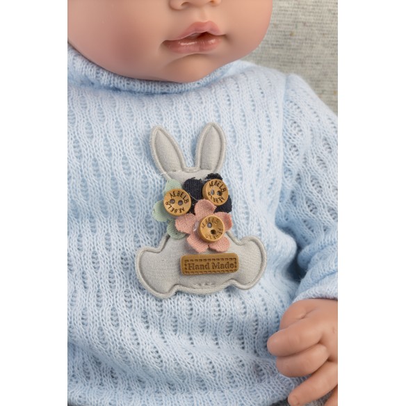 Muñeco Marco, jersey de lana azul con adorno en el pecho en forma de conejito gris, pantalón y gorro de lana gris con pompon azul.