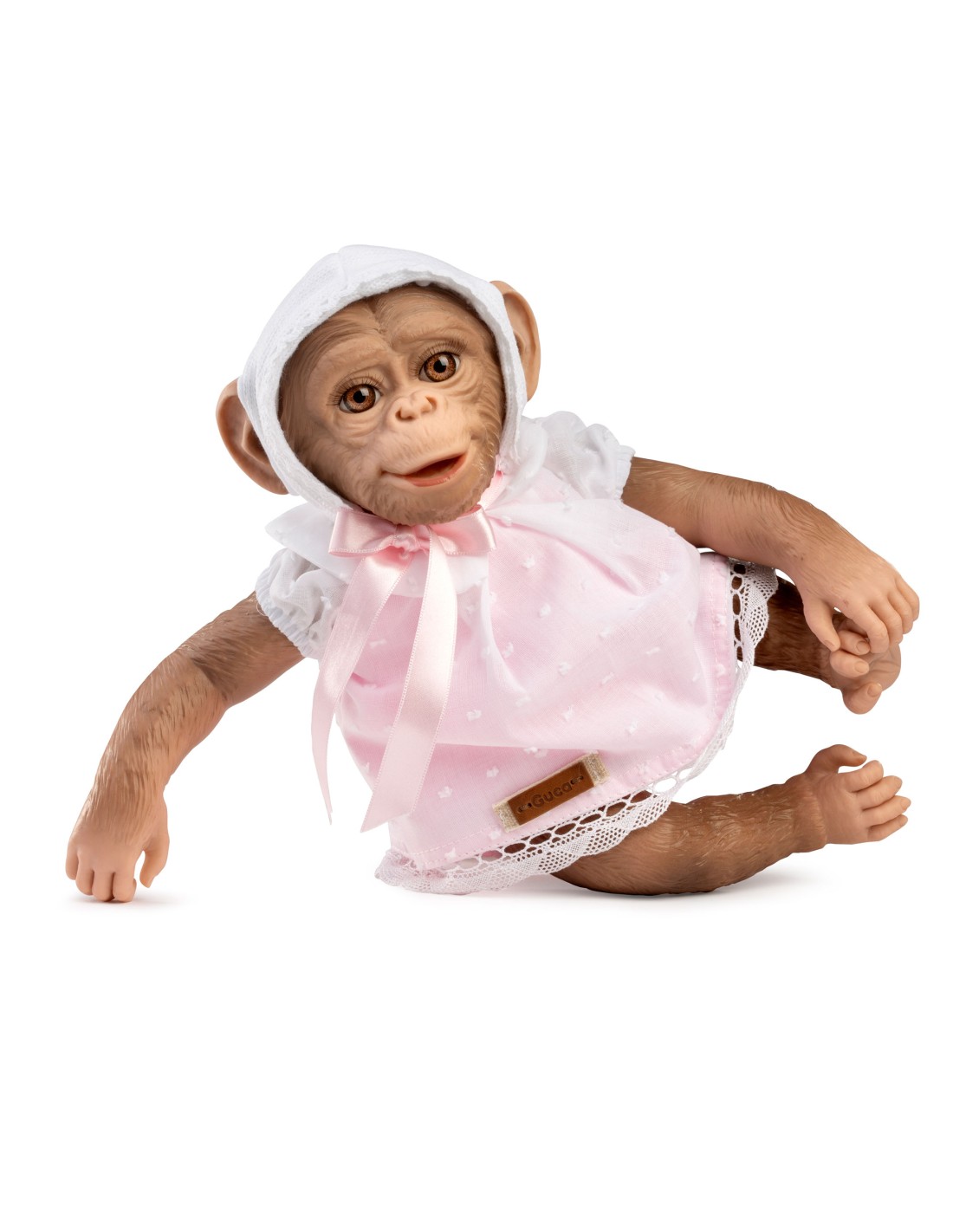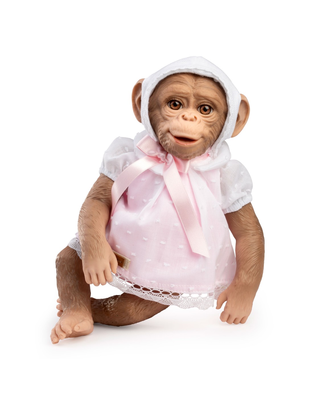 Lleva un vestido rosa con cuello bebé blanco con capota lana blanca anudado con cinta de raso rosa, incluye braguitas. Adopta posturas y puede colgarse con sus manos o pies. Fabricado en España.