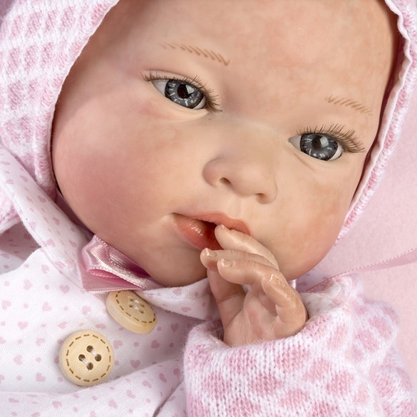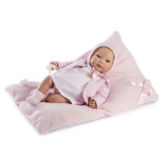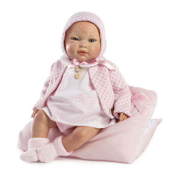 Bianca es una reborn de 42 cm pintada a mano. Viste vestido rosa con chaqueta, braguita, gorro y calcetines. Incluye cojín, certificado de autenticidad, cartilla de nacimiento y mini catálogo.