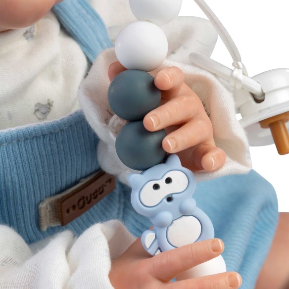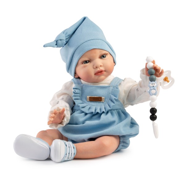 Va vestido con un pelele de tirantes de pana azul con babero, gorro dormilón y camiseta beig de manga larga con dibujos infantiles. También tiene incluidas sus zapatillas azules y blancas, cadena, chupete y pañal. Fabricado en España.