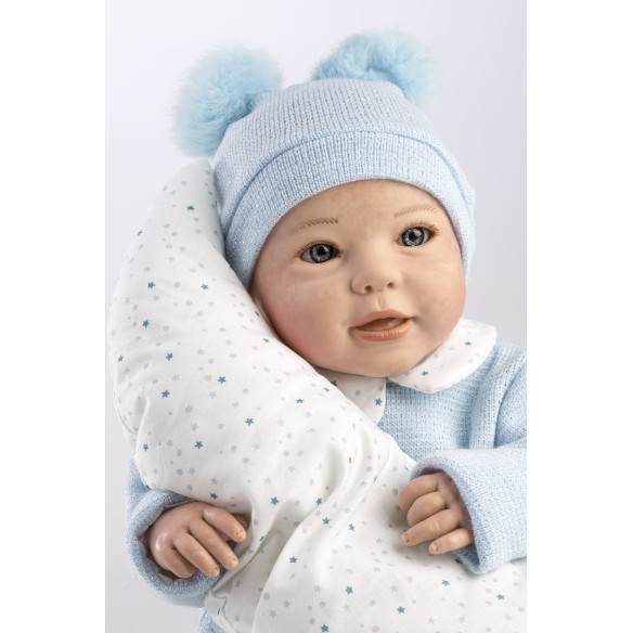 Viste un precioso conjunto tejido en lana azul brillante: jersey de punto fino, braguitas a juego y un gorrito con pompones que realzan su dulzura. Un modelo ideal para quienes buscan vivir una experiencia emocional con su primer Reborn auténtico. Cada detalle ha sido cuidado con mimo para transmitir ternura, realismo y ese vínculo tan especial que solo se siente con un verdadero bebé Reborn.