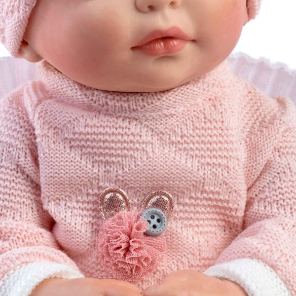 Reborn prematuro Lea está vestida con una polaina de lana beig y rosa para los pies, jersey de lana de manga larga de lana rosa con un adorno en el pecho rosa y dorado, además de un gorro de la msima lana color rosa con dos orejitas.