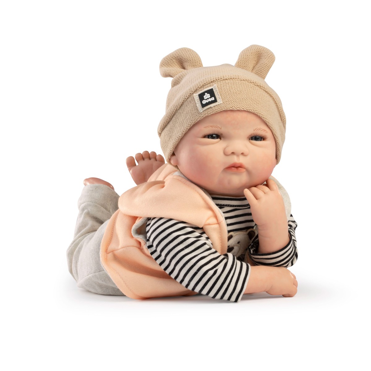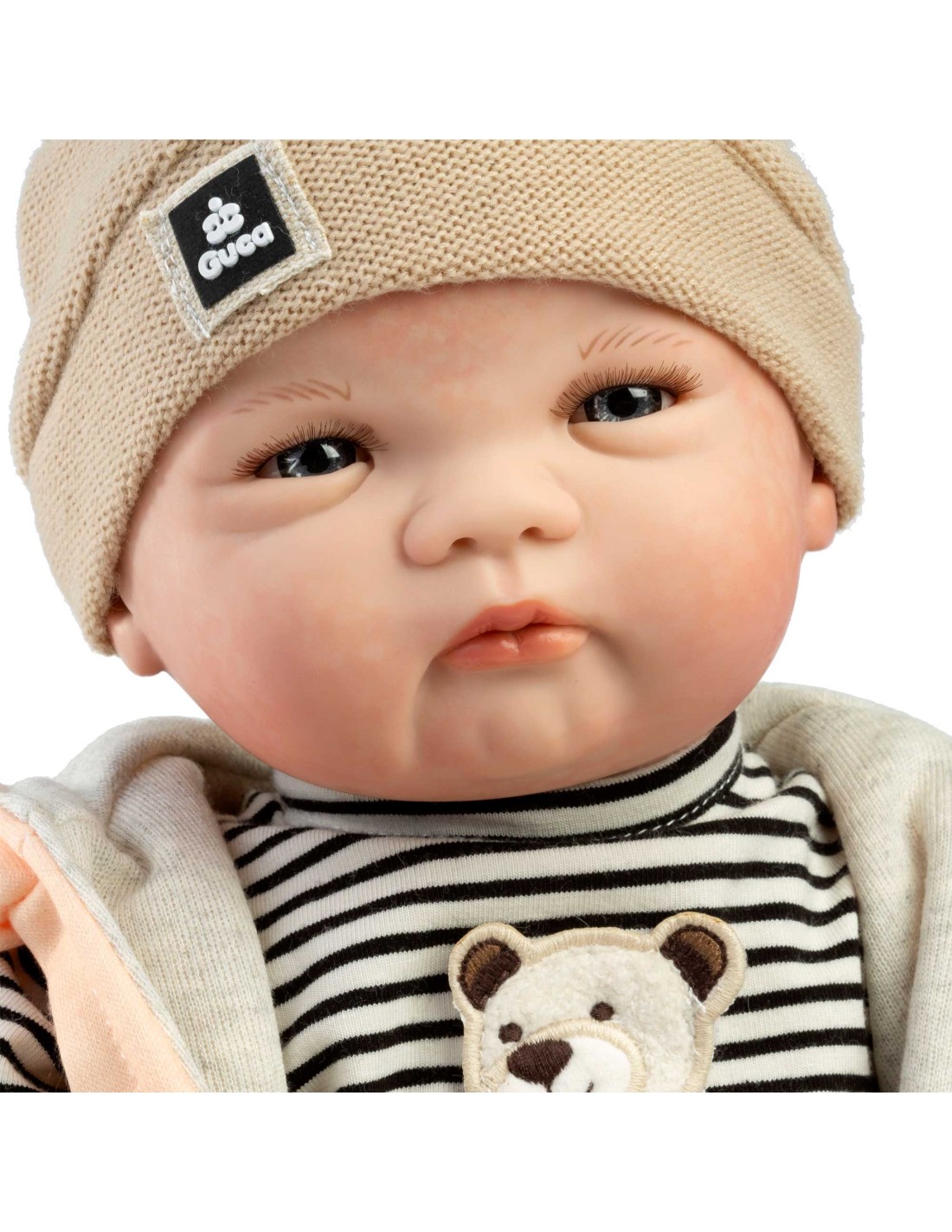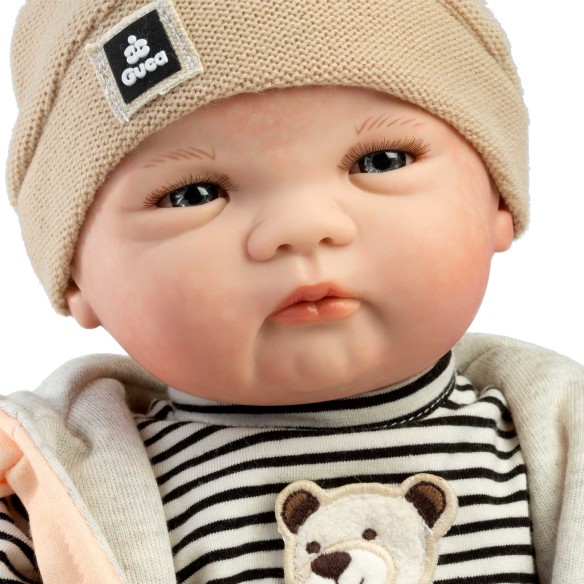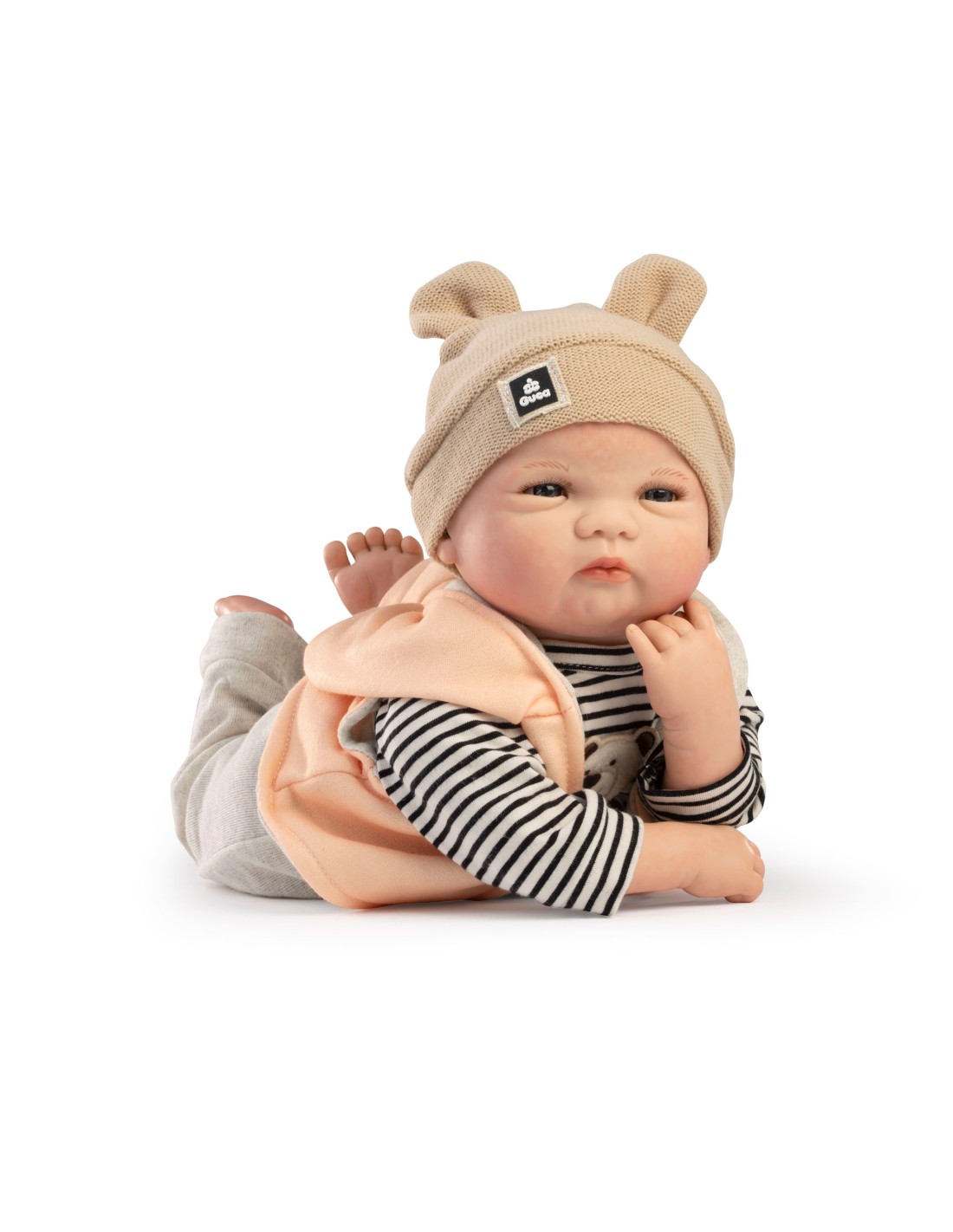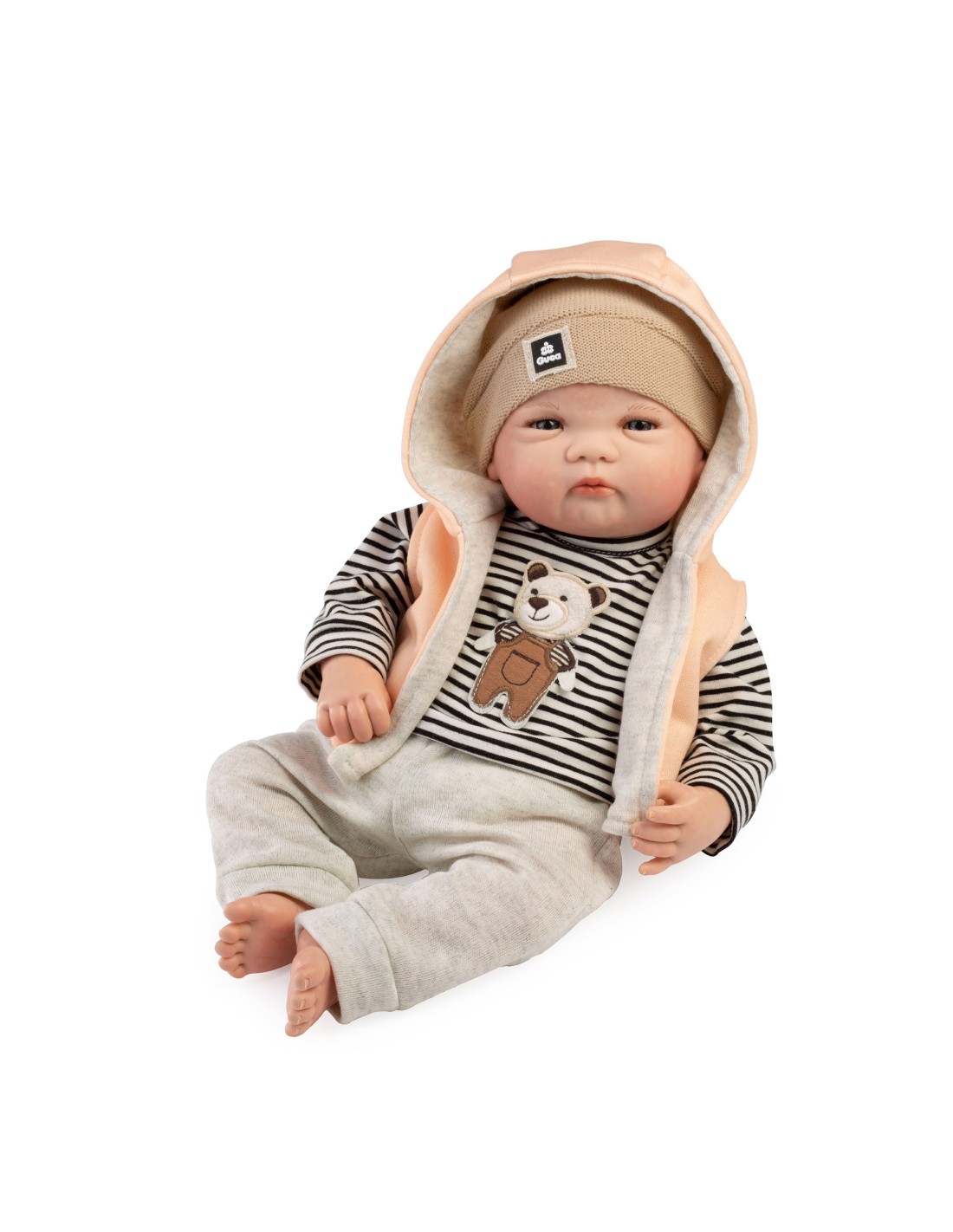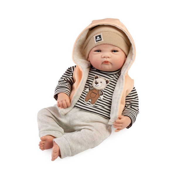 Reborn Martí,vestido con pantalón de punto beig, camiseta de manga larga con rayas beig y negras con un osito de adorno en el pecho. Un chaleco de punto naranja con capucha, gorro de lana beig.