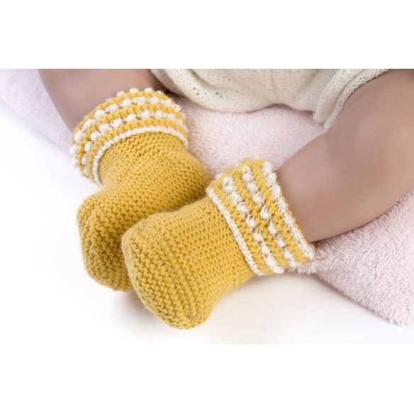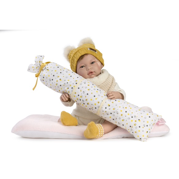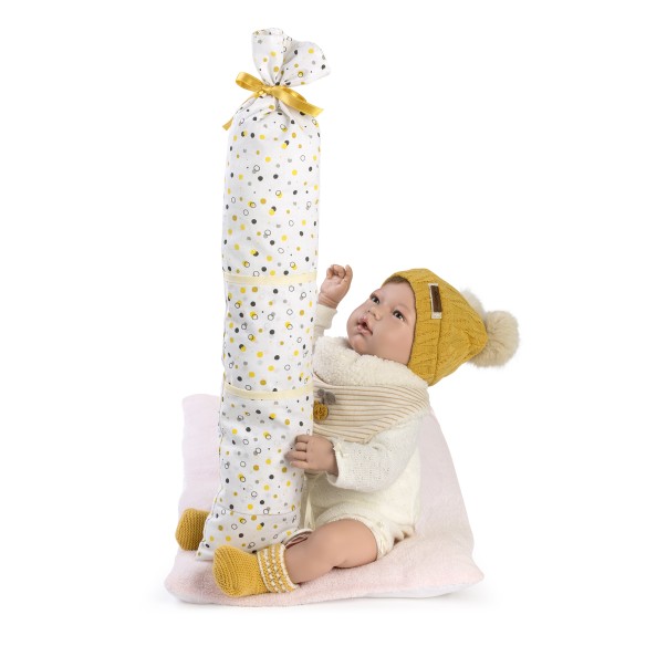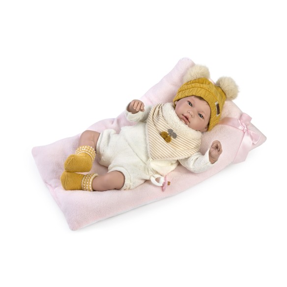 Viene vestida con un conjunto en tonos beige y rosa empolvado, que incluye pijama de punto, gorrito con pompón, babero, calcetines y un cojín blandito a juego. Además, se acompaña de una funda textil para guardar sus accesorios. Todo ello en armonía para completar una presentación cuidada y elegante.