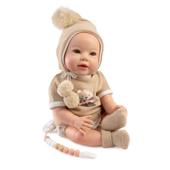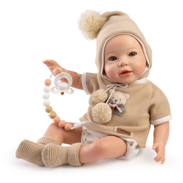Va vestido con un jersey de manga corta de lana beig con adorno de osito en el pecho y braguitas blancas con dibujos infantiles, además, de un gorro puntiagudo de la misma lana beig con cordones acabado en 2 pompones beig para poder anudarlo. Los complementos incluidos son sus calcetines de lana beig, cadena con chupete y pañal. Fabricado en España.