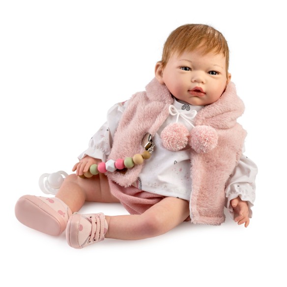 Reborn Naiara, pintado a mano con detalles realistas y pelo natural pegado, braguita rosa de lana, camisa blanca, chaleco de pelo rosa, zapatillas y chupete con cadena.