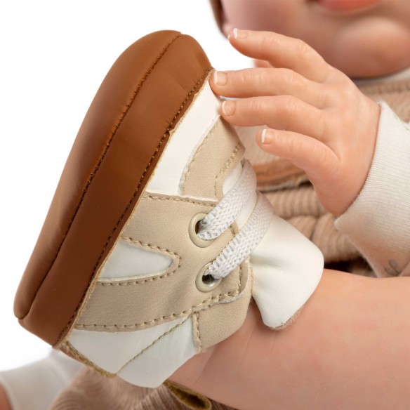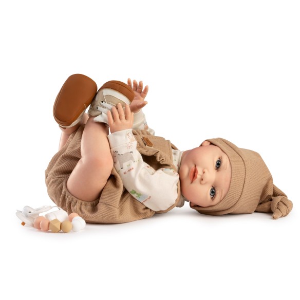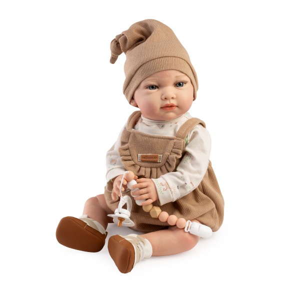 Va vestido con un pelele de tirantes de pana marrón con babero, gorro dormilón y camiseta beig de manga larga con dibujos infantiles. También tiene incluidas sus zapatillas en tonos marrones, cadena, chupete y pañal. Fabricado en España.