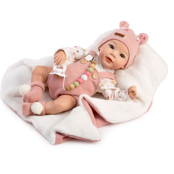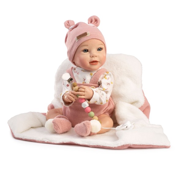 Reborn prematuro Nadia, lleva un gorro con orejitas, pelele de lana lisa rosa con camiseta de maga larga color crudo y pequeños dibujos infantiles, calcetines de lana rosa con pompón. Como complemento incluye una manta rosa y blanca, chupete de bolitas, cadena y pañal. Mide 38 cm y pesa aprox. 1,900 kg. Fabricado en España.