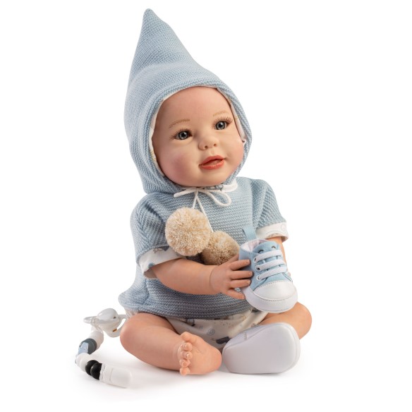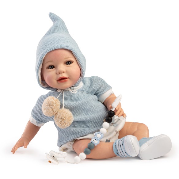 Va vestido con un jersey de manga corta de lana azul y braguitas beig con dibujos infantiles, además, de un gorro puntiagudo de la misma lana azul con cordones acabado en 2 pompones beig para poder anudarlo. Los complementos incluidos son sus zapatillas azules, cadena con chupete y pañal. Fabricado en España.