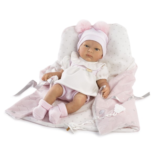 Reborn silicona Sira, su cuerpo y extremidades son de silicona, de una pieza. Está pintada a mano y tiene detalles como venas, rojeces, textura de la piel, uñas, tacto suave y blando. No tiene pelo. Mide 36 cm y su peso es 1,900 kg aprox. Es un bebé hiperrealista sexuado. Lleva un vestido blanco de punto, braguitas rosas, gorro blanco con 2 pompones, calcetines rosas de lana y como complemento lleva una mantita. Incluye pañal y chupete. Fabricado en España. Su caja cuenta con un certificado de autenticidad, cartilla de nacimiento, libro de cuidados y un pequeño catálogo donde ver muchos más modelos.