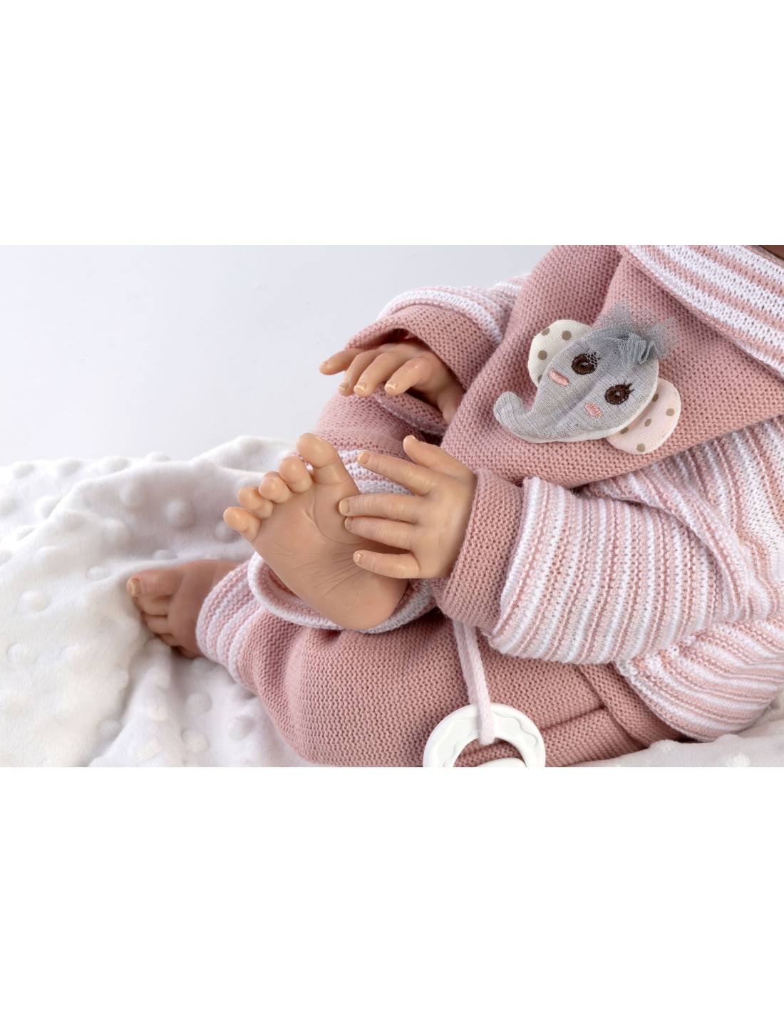 Como complementos lleva un babero con cuello y detalle de elefante en el centro, manta con orejitas rosa forrada de tela de burbuja blanco. No tiene pelo, mide 42cm y pesa aproximadamente 2,200kg. Su cuerpo es de tela y extremidades de goma de vinilo, con efecto de caída de la cabeza, incluye pañal.