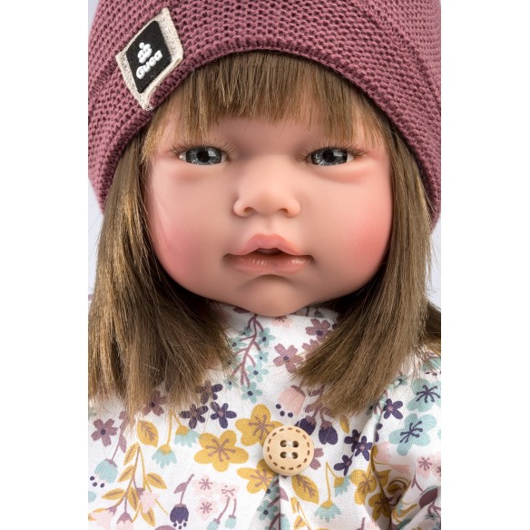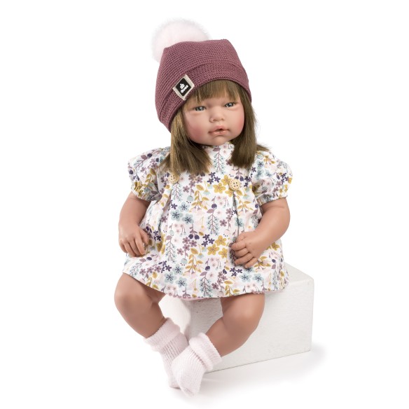 Muñeca Sarai con pelo largo moreno. Lleva un vestido de manga corta estampado de flores en tonos morados, ocres y turquesa, con braguitas rosa a juego. Gorro de lana granate y peúcos rosas.