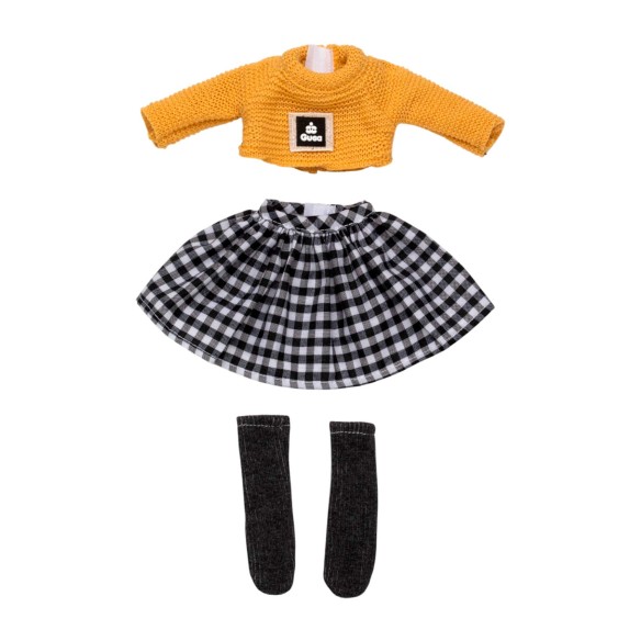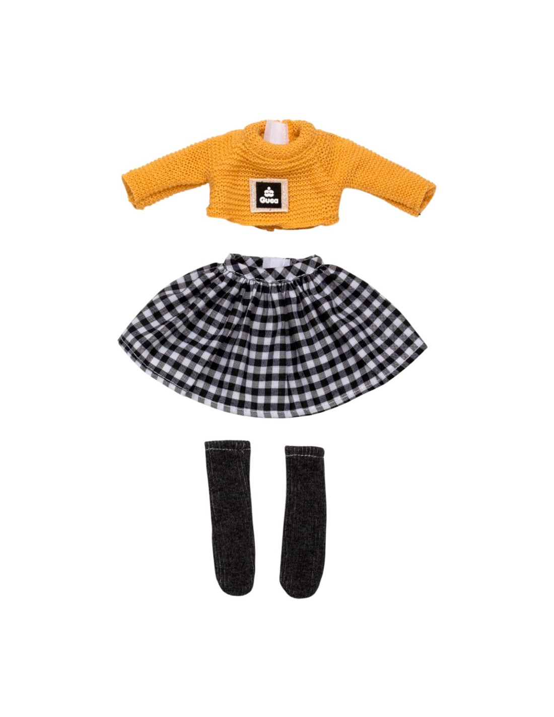 Conjunto para Penélope - Jersey ocre de lana, falda de cuadros blanco y negro, calcetines negros