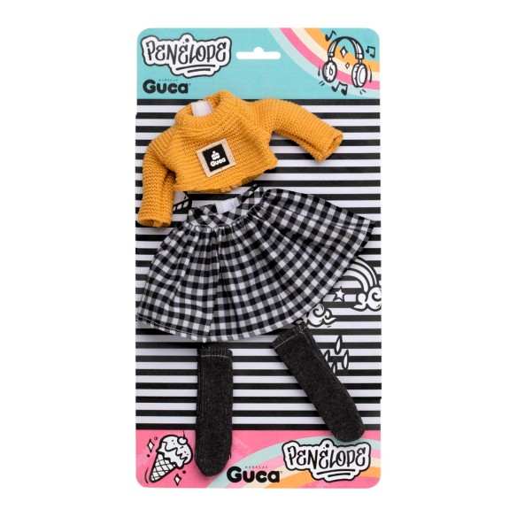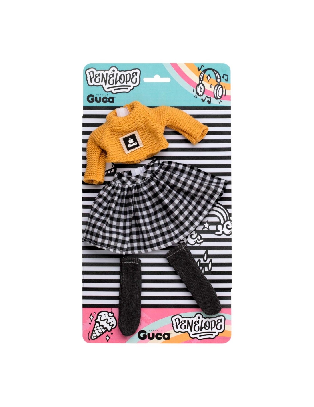 Ropa Penélope – Jersey ocre de lana, falda de cuadros blanco y negro, calcetines negros