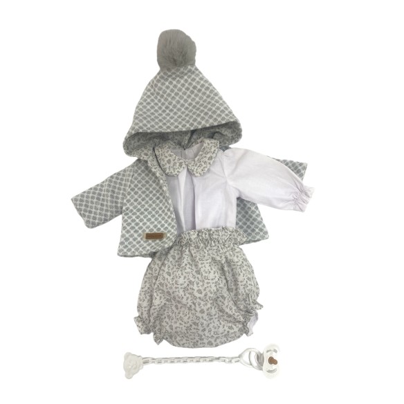 Ropa para bebe reborn, camisa blanca, manga larga con cuello estampado de flores en tonos grises, pololo de este mismo estampado y color, chaqueta de punto panal de abeja en color gris, con capucha y pompón. Incluye chupete con cadena.