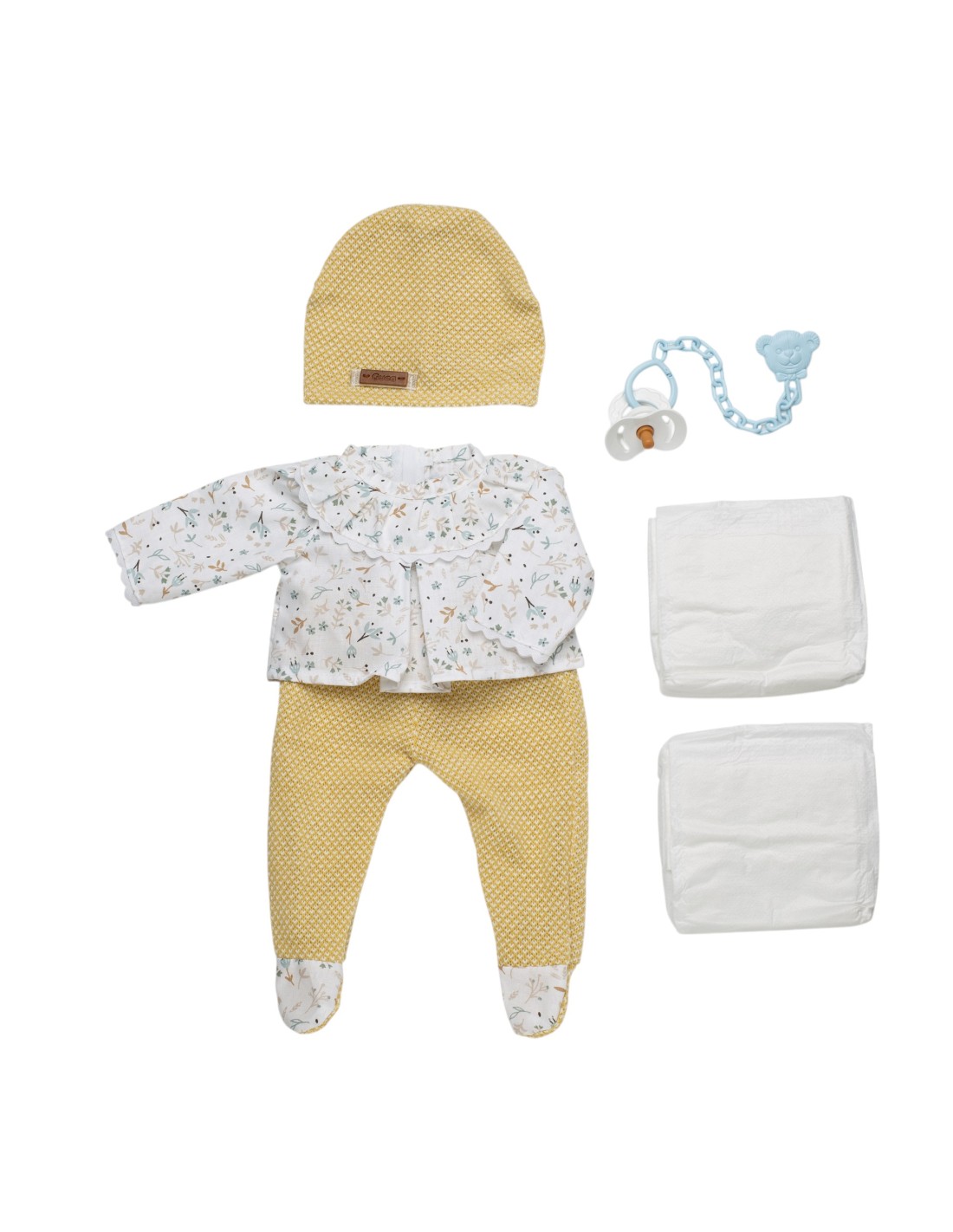 Ropa reborn talla 38cm - conjunto de pantalón amarillo, con camisa con estampado de flores, pañales y chupete con cadena