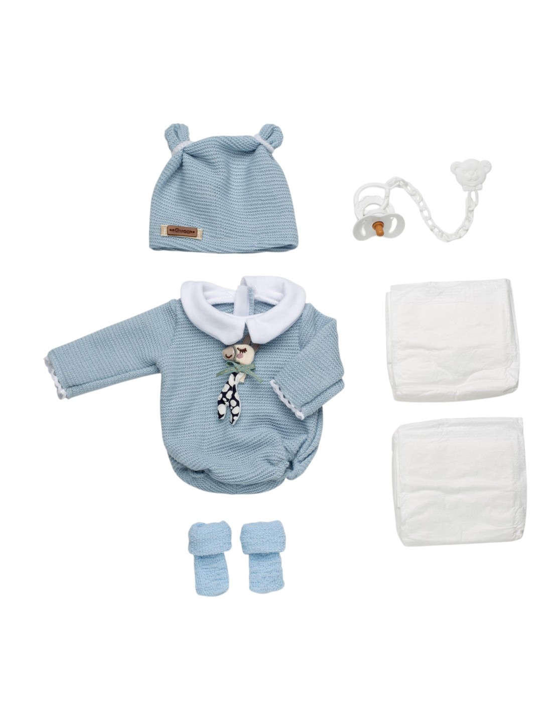 Ropa para muñecos Reborn de 38 cm. pelele de lana azul, gorro, peucos, pañales y chupete con cadena