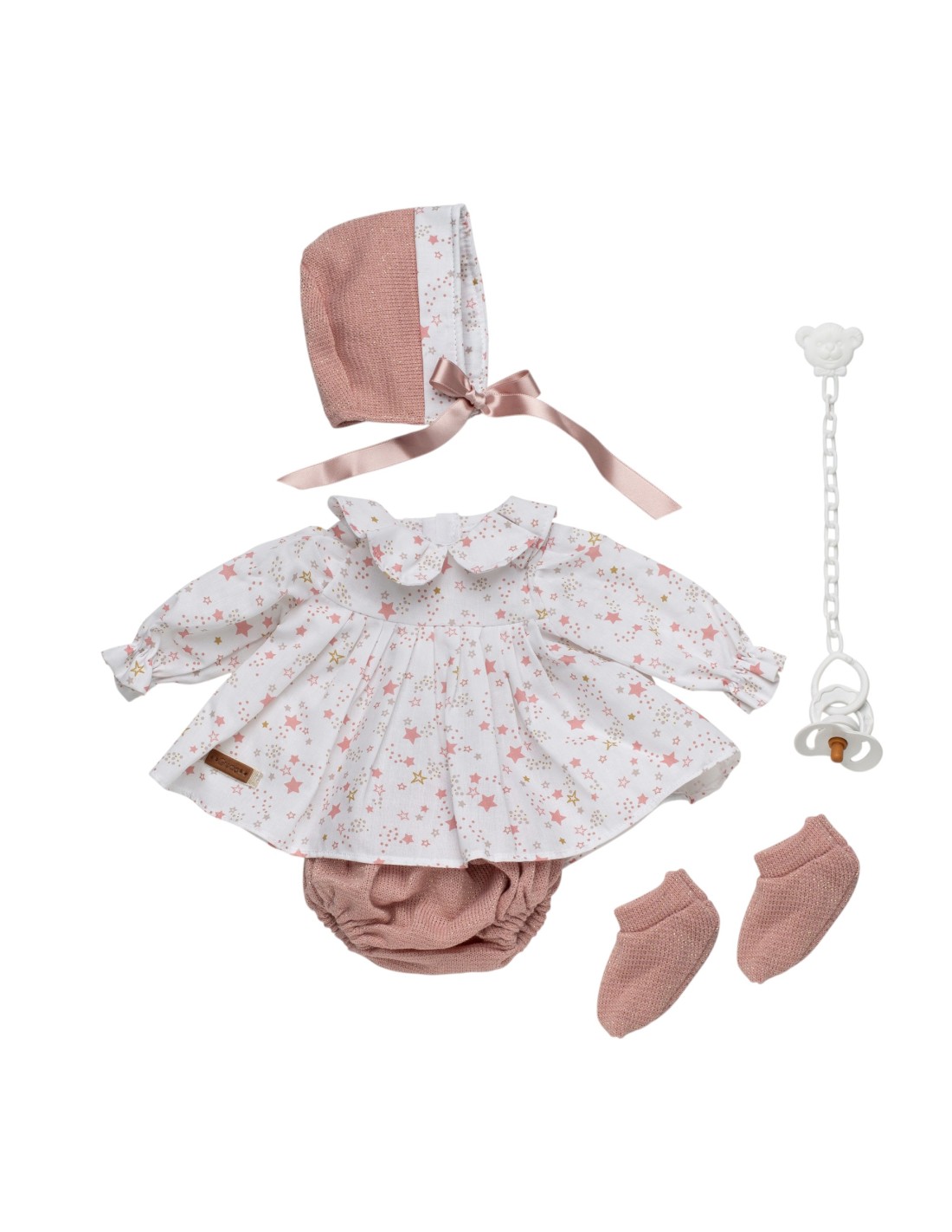 Ropa reborn talla 46cm - pelele con vestido, estampado de estrellas, capota con lazo, peucos y chupete con cadena