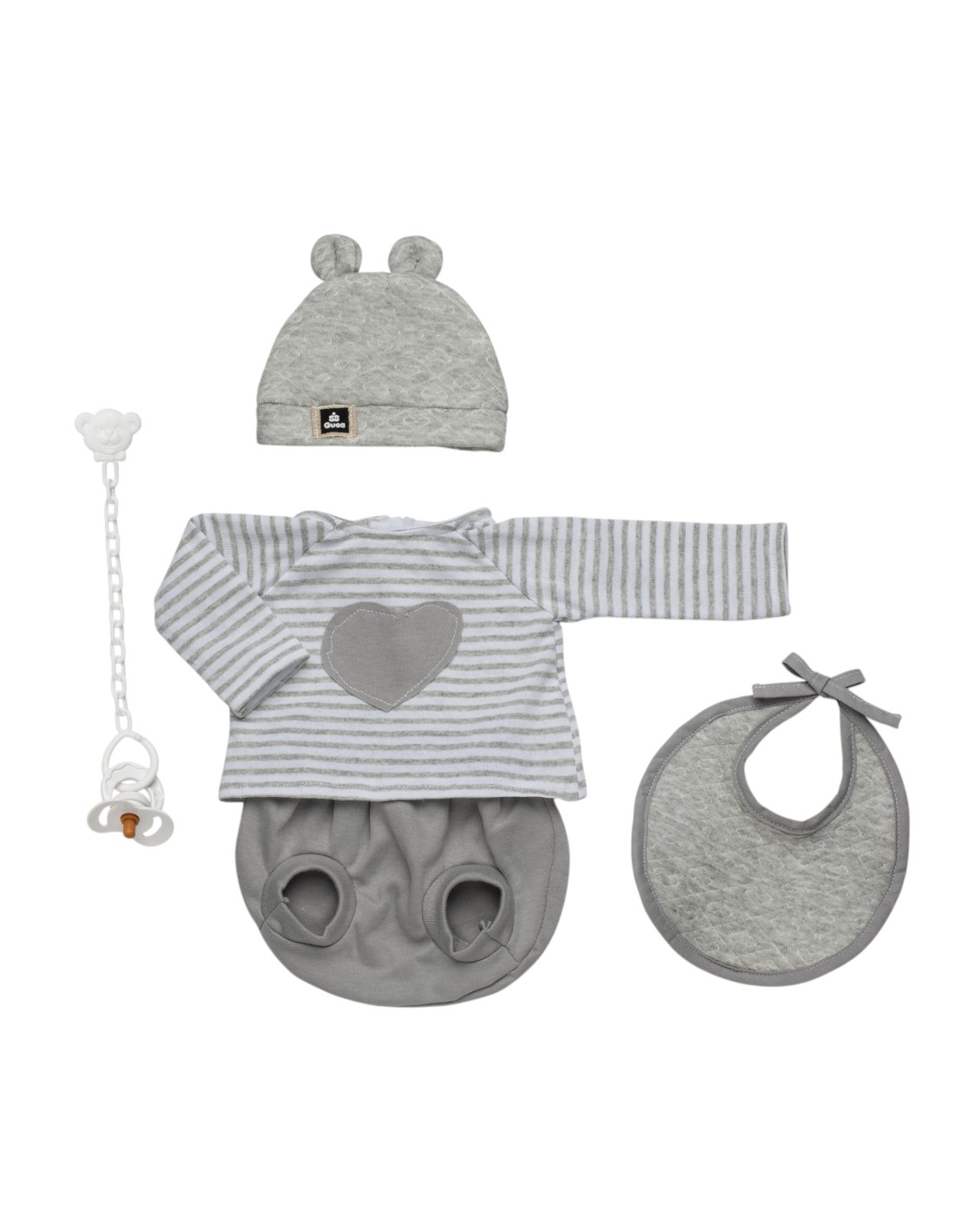 Ropa para muñecos Reborn de 46 cm. Pelele gris, camiseta con a rayas grises con corazón, gorro, babero y chupete con cadena