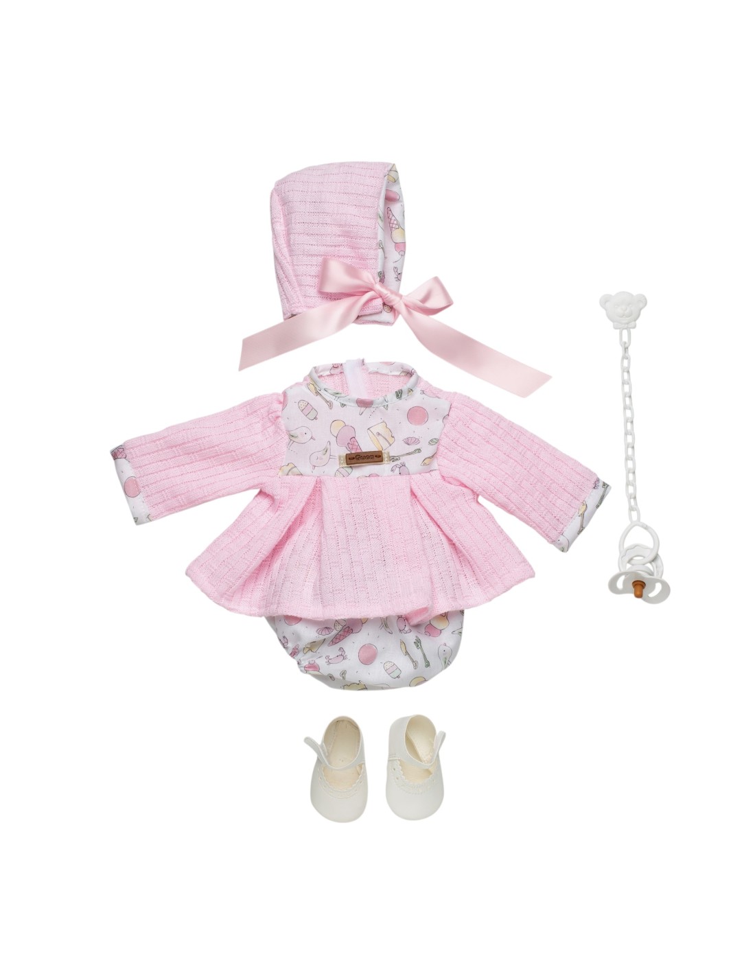 Ropa para muñecos Reborn de 46 cm. Pelele rosa con estampado de dibujitos, capota con lazo, zapatos blancos y chupete con cadena.