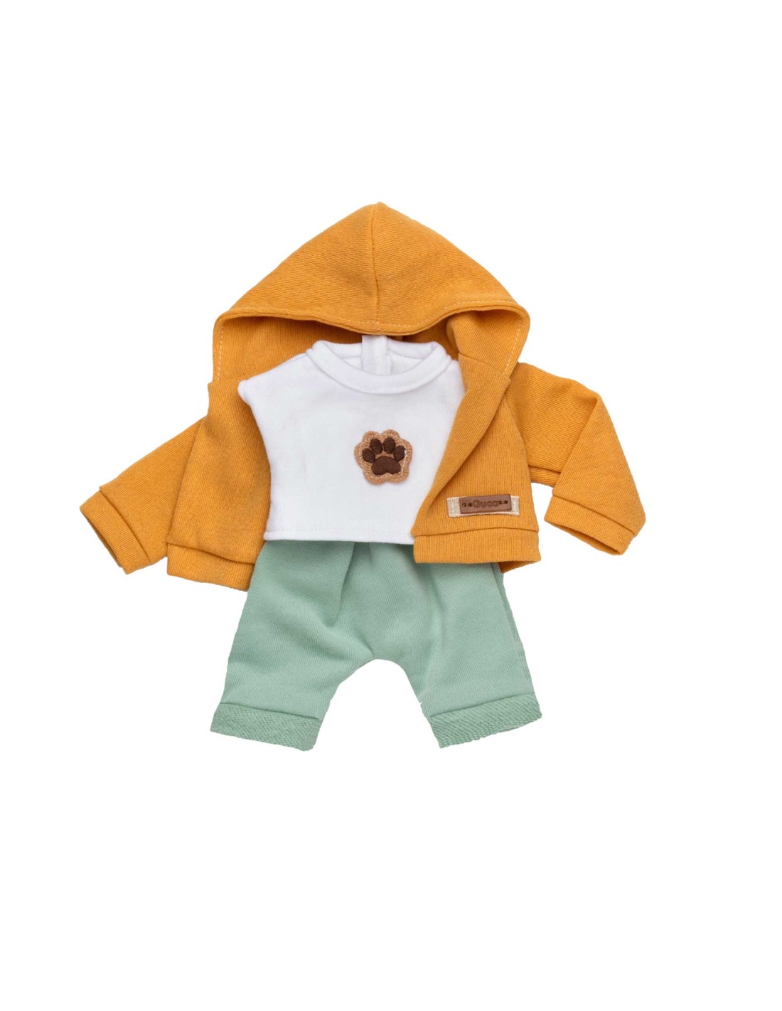 Conjunto para Mono Reborn de 32cm. Conjunto camiseta manga corta con dibujito de huella. Chaqueta con capucha color ocre, pantalón verde
