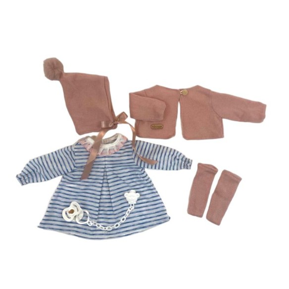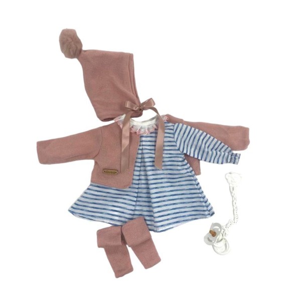 Conjunto para Reborn compuesto por vestido azul de rayas, chaqueta de punto terracota, gorro a juego, calcetines y chupete con cadena blanca. Para muñecos de 42 a 46 cm.